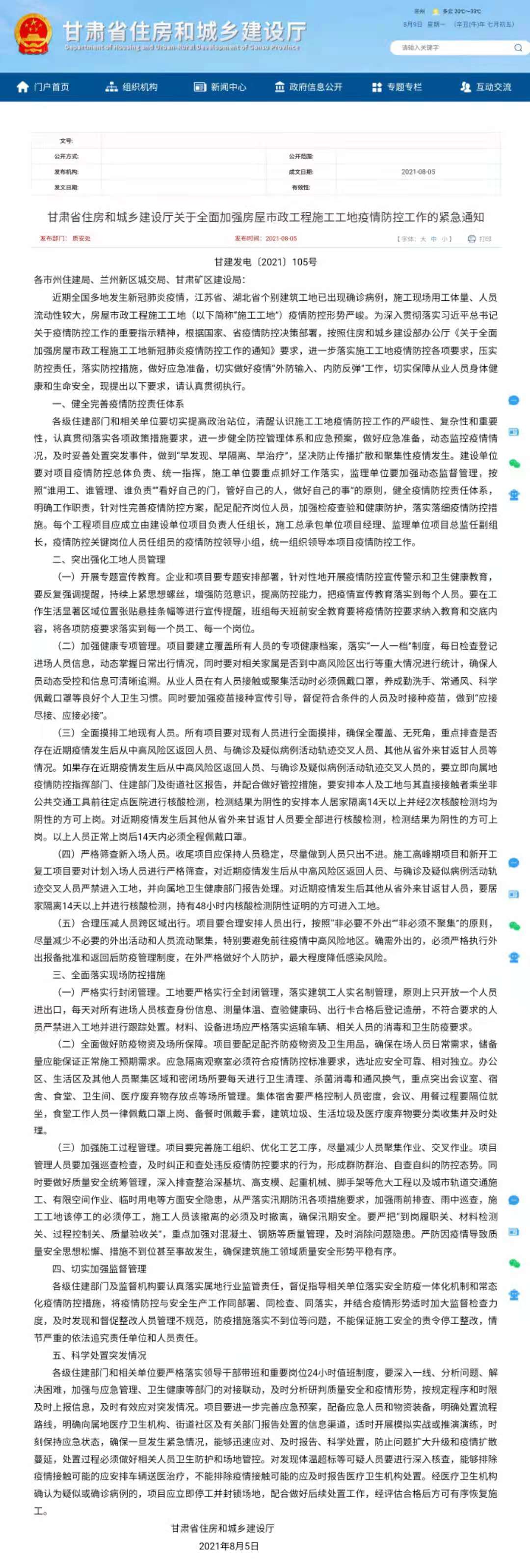 為深入貫徹落實習(xí)近平總書記關(guān)于疫情防控工作的重要指示精神,根據(jù)國家、省疫情防控決策部署,按照住房和城鄉(xiāng)建設(shè)部辦公廳《關(guān)于全面加強房屋市政工程施工工地新冠肺炎疫情防控工作的通知》要求,確保安全生產(chǎn)和正常施工生產(chǎn)秩序,現(xiàn)將《甘肅省住房和城鄉(xiāng)建設(shè)廳關(guān)于全面加強房屋市政工程施工工地疫情防控工作的緊急通知》轉(zhuǎn)發(fā)給你們,請各單位遵照執(zhí)行。