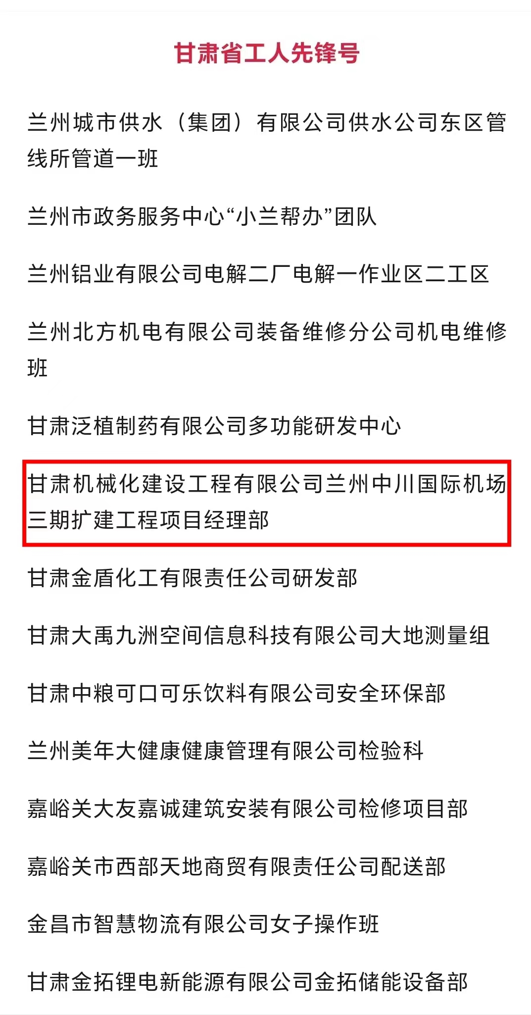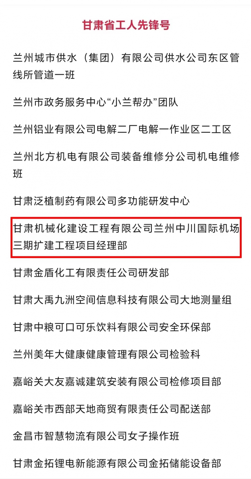 近日,甘肅省總工會發布了2024年甘肅省“五一勞動獎和甘肅省工人先鋒號”擬表彰對象的公示。我司蘭州中川國際機場三期擴建工程項目經理部被授予“甘肅省工人先鋒號”,該獎的獲得既是對項目團隊長期拼搏奮斗的肯定,也是對公司“和諧共進、追求卓越”企業精神的肯定。